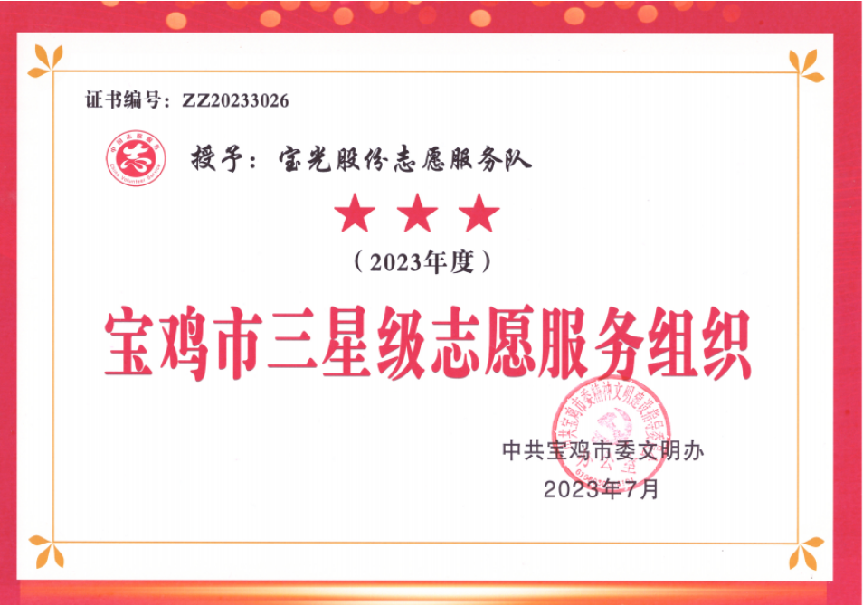 日前,寶光股份志愿服務隊被中共寶雞市委文明辦評為“寶雞市三星級志愿服務組織”。