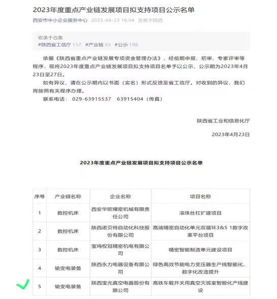 通過認(rèn)真籌備、資料審核及現(xiàn)場答辯,由公司組織申報的“72.5kV、126kV及以上高電壓等級真空滅弧室產(chǎn)品研發(fā)及產(chǎn)業(yè)化”項(xiàng)目與“高鐵車載開關(guān)用真空滅弧室智能化產(chǎn)線建設(shè)”項(xiàng)目分別中榜陜西省工信廳2023年關(guān)鍵核心技術(shù)產(chǎn)業(yè)化“揭榜掛帥”項(xiàng)目與重點(diǎn)產(chǎn)業(yè)鏈發(fā)展項(xiàng)目,并已進(jìn)入公示階段。